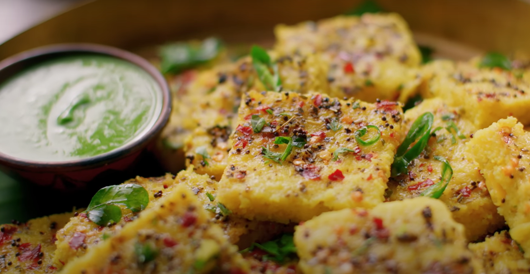 Then add the mustard seeds , green chili and asafoetida , stir well and cook briefly , finally add the curry leaves and pour the tempering over the dhokla equally , garnish with some fresh coriander leaves
