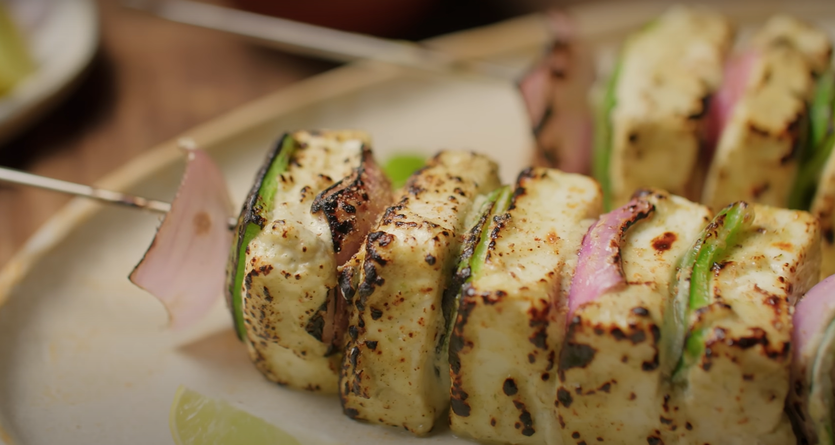 Your delicious afghani paneer tikkas are ready sprinkle some chaat masala and squeeze a bit of lemon while serving . To cook these in an airfryer , preheat the air fryer on 200 C for10-15 minutes , then skewer the paneer and the veggies similarly on a bamboo skewer
