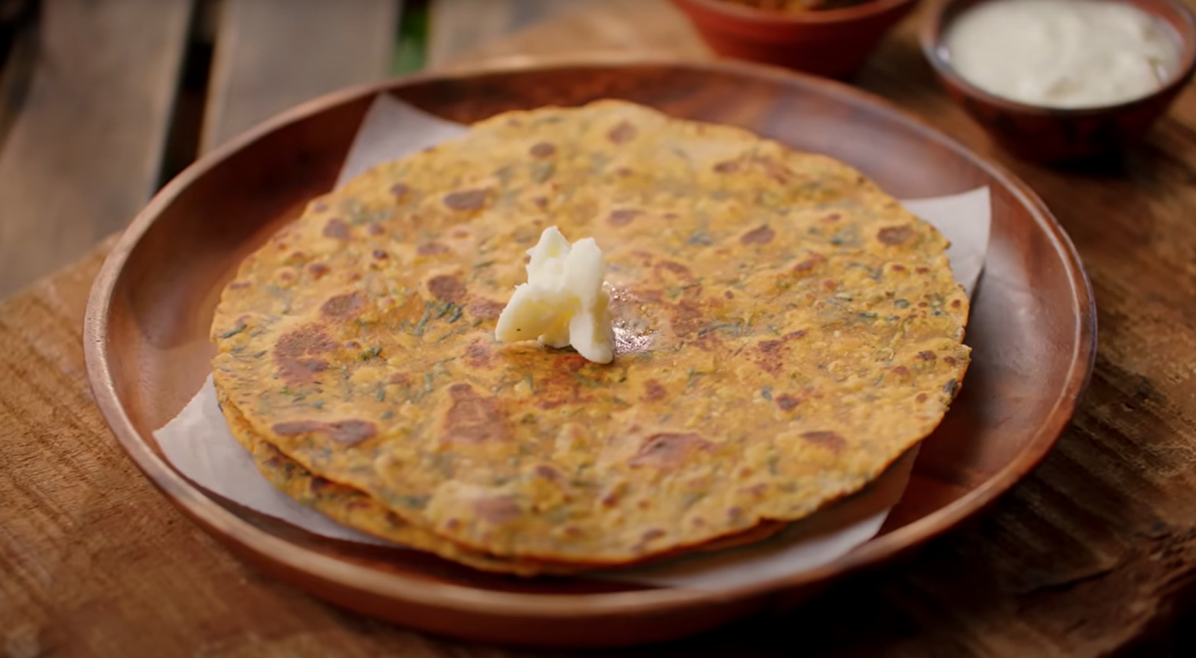 Thepla is made from a dough containing gram flour besan and spices, resulting in a softer, thinner flatbread that stays fresh longer. It is typically made with fenugreek leaves methi or other greens.