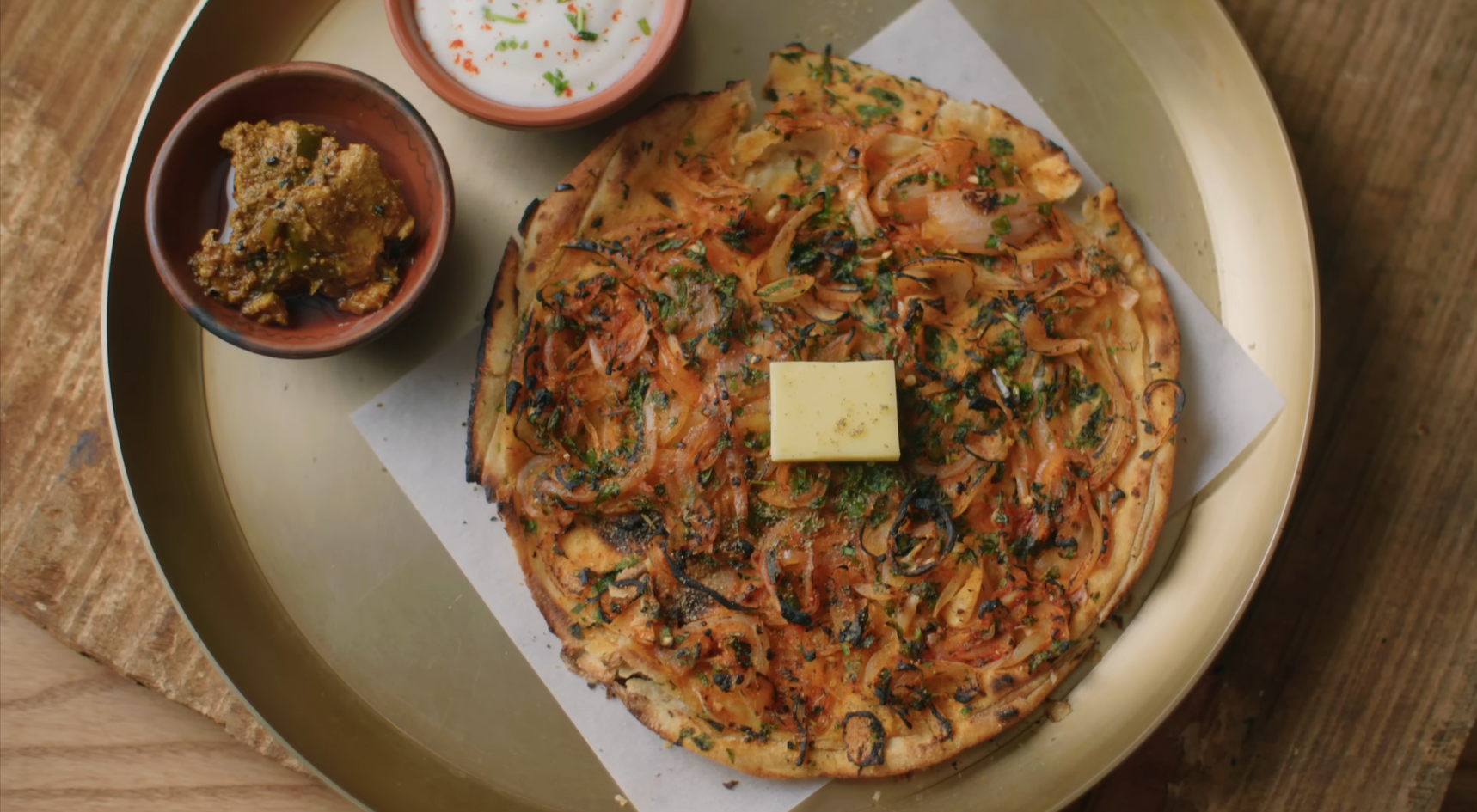 To replicate a tandoor effect at home , make a laccha pedha the same way but without adding onion filling inside . Spread some ghee on the rolled dough , sprinkle wheat flour , roll into a cone again , press , and roll into a paratha . Spread a layer of the onion filling on top along with some fresh coriander and chopped green chilies , place a butter paper sheet over it , and gently press with a rolling pin so the filling sticks well
