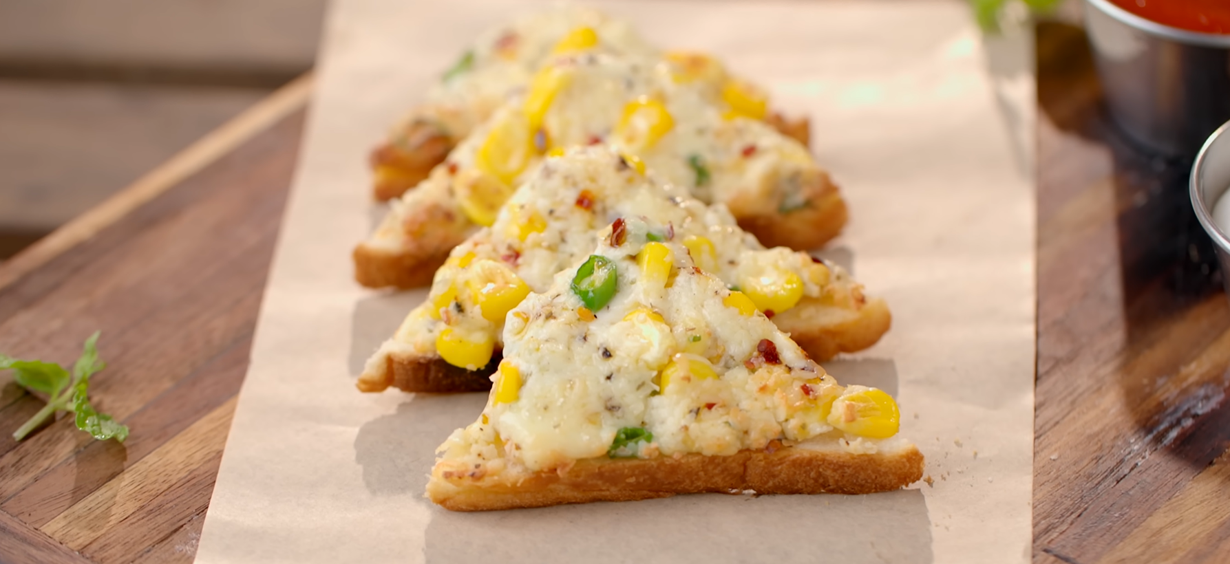 Your cheese chili corn toast is ready , cut into squares or triangle serve hot with green chutney , ketchup , mayonnaise or any dip of your choice