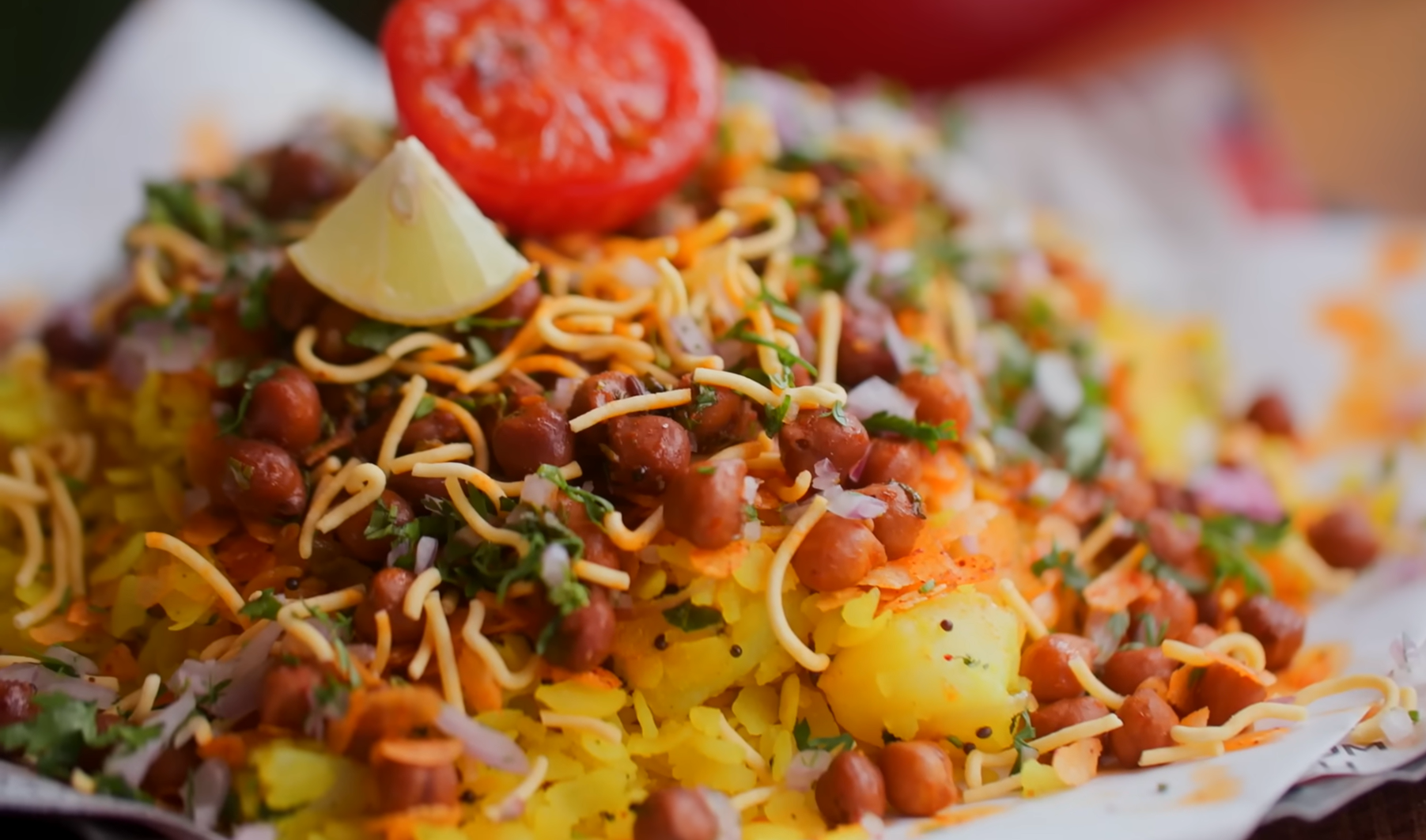 Serve steaming hot poha and top it with kaccha chiwda , further topping it with very hot tari with a small amount of chana and a tomato piece . Garnish with some onions , fresh coriander and some lemon juice , serve it hot